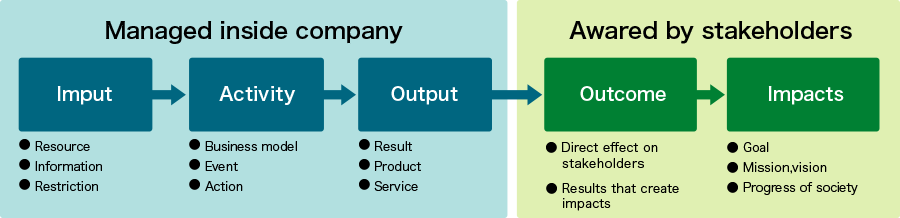 Impact Thinking is to think logically about the impact of one's actions or the activities of a company or organization and beyond, as shown in the figure below. Based on the following definition, SuMi TRUST Bank creates an impact pathway (logic model) by logically connecting multiple medium-term social and environmental changes (impact), outcomes for stakeholders (outcome), and outputs generated by corporate activities, and conduct impact measurement.