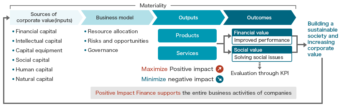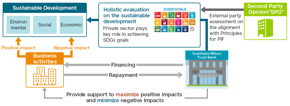 SuMi TRUST Bank supports the efficient and effective operation of the value creation process and the cyclical improvement of business activities and results by assessing the environmental, social, and economic impact of a company's overall commercialization activities through the Positive Impact Finance and monitoring KPIs.